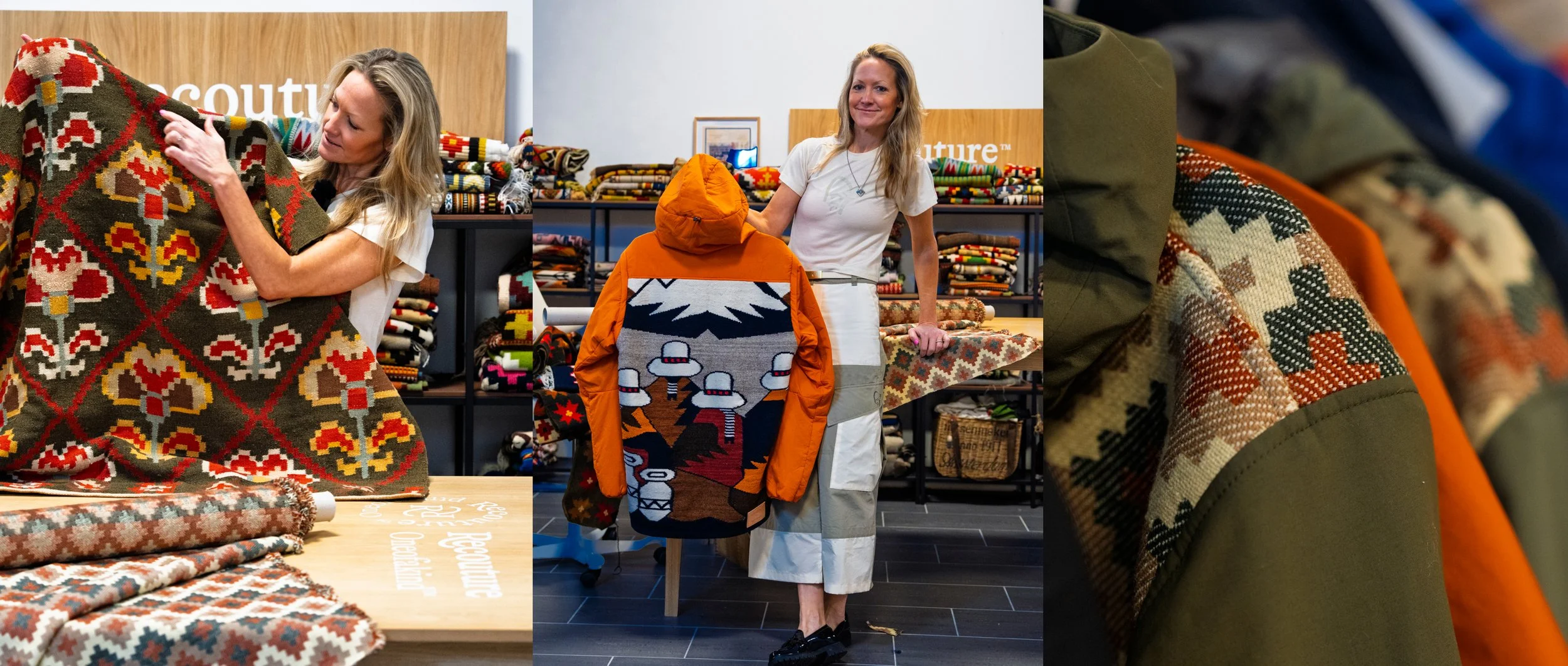 In the studio, the process begins slowly. Pieces are laid out. Turned. Considered. Each one carrying marks of its previous life — wear, repairs, fragments of use.